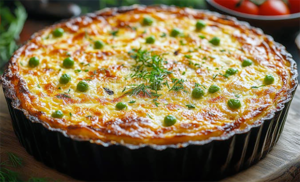 Line the tart base with the green beans, peas (reserve a few for garnish), and flaked tuna. Pour over the quiche mixture then garnish with a few of the peas.