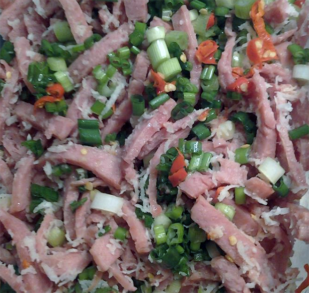 Spam Kelaguen is a traditional Northern Mariana Islands recipe for a classic salad of lightly-fried spam strips in a lemon juice base with spring onions, coconut and chillies. The full recipe is presented here and I hope you enjoy this classic Northern Mariana Islands version of: Spam Kelaguen.