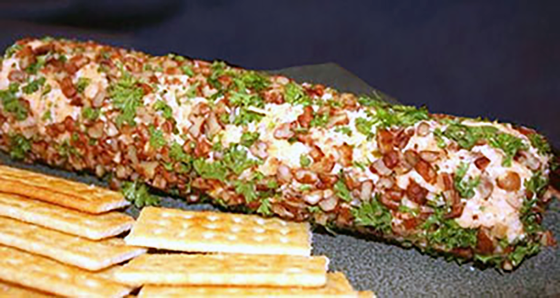 Spicy Cheese Log: An American recipe for a party side dish or dip of a log made from a blend of cheese, in a cream cheese base coated with nuts and parsley.