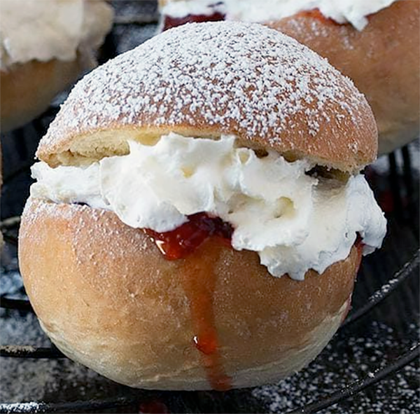 Remove from the oven and allow to cool on a wire rack until completely cold. To serve, split a bun in half and serve filled with plenty of Cornish clotted cream and jam (raspberry or strawberry are typical).