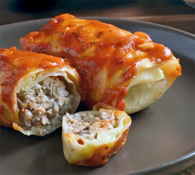 This is the US version of dolmas or dolmades, cabbage leaves stuffed with a mix of meat, rice and onion cooked in a sweetened tomato sauce base. With its blend of pork, greens and rice this can be served as a lucky dish or accompaniment to celebrate the New Year.
