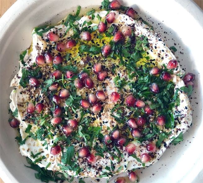 The following day combine the sweet cicely seeds, sesame seeds, thyme, lemon zest and sumac in a bowl. Carefully turn out the cooled labnah onto a plate, making sure it keeps its rounded shape, then drizzle the olive oil over the top and sprinkle the seed mixture over the top. Garnish with pomegranate seeds.
