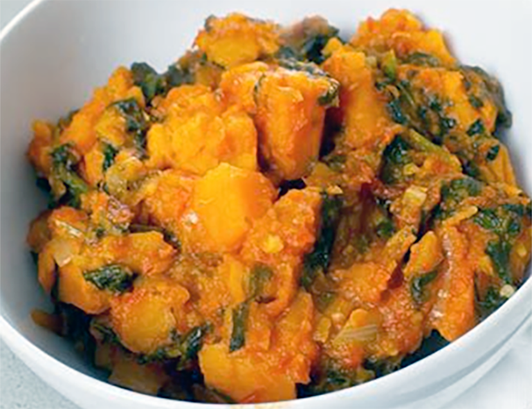 Pour in just enough water to cover the ingredients, bring to a boil, add the greens and continue to cook for about 20 minutes, or until the sweet potatoes begin to break down around the edges.