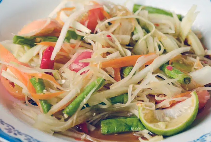 In Laotian cuisine, green papaya salad is typically eaten with sticky rice. You can enjoy it on its own as a full meal or as an accompaniment to barbecued chicken or pork.