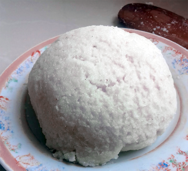 Use the wet wooden spoon to press the Ugali (Cornmeal) into a round mound. As you press, keep turning the plate so that you can shape the whole Ugali. Serve immediately as an accompaniment.