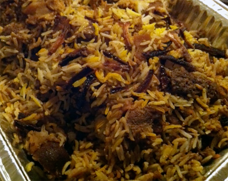 Dust the onions with flour then deep fry in hot oil until golden. Add half the onions to the marinated lamb mixture then scrape into a large pyrex baking dish (enough to hold the marinated lamb and the parboiled rice).